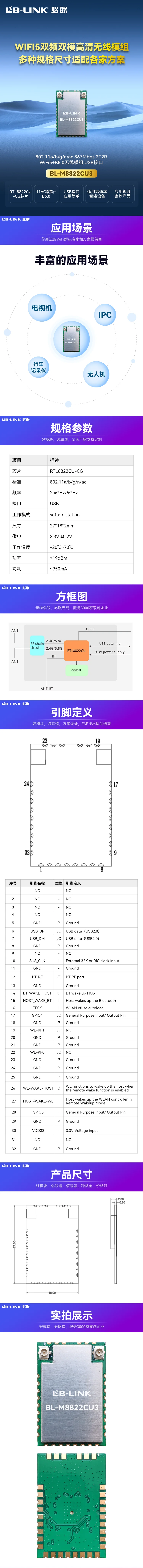2T2R 802.11a/b/g/n/ac WiFi+B5.0模组